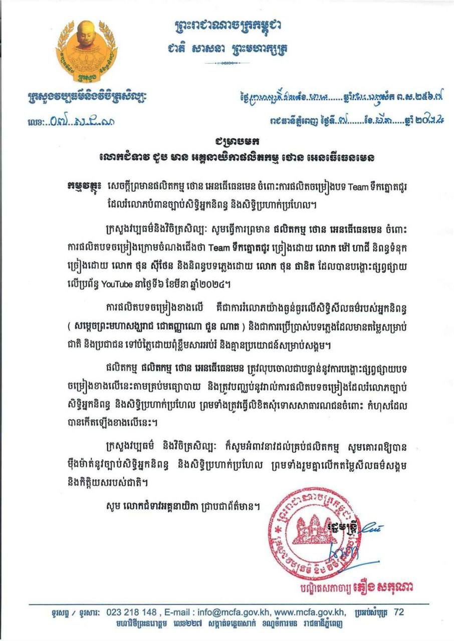 ក្រសួងវប្បធម៌និងវិចិត្រសិល្ប: បានសេចក្តីព្រមានផលិតកម្ម ថោន អេនធើធេនមេន ចំពោះការផលិតចម្រៀងបទ “Team ទឹកត្នោតជូរ”