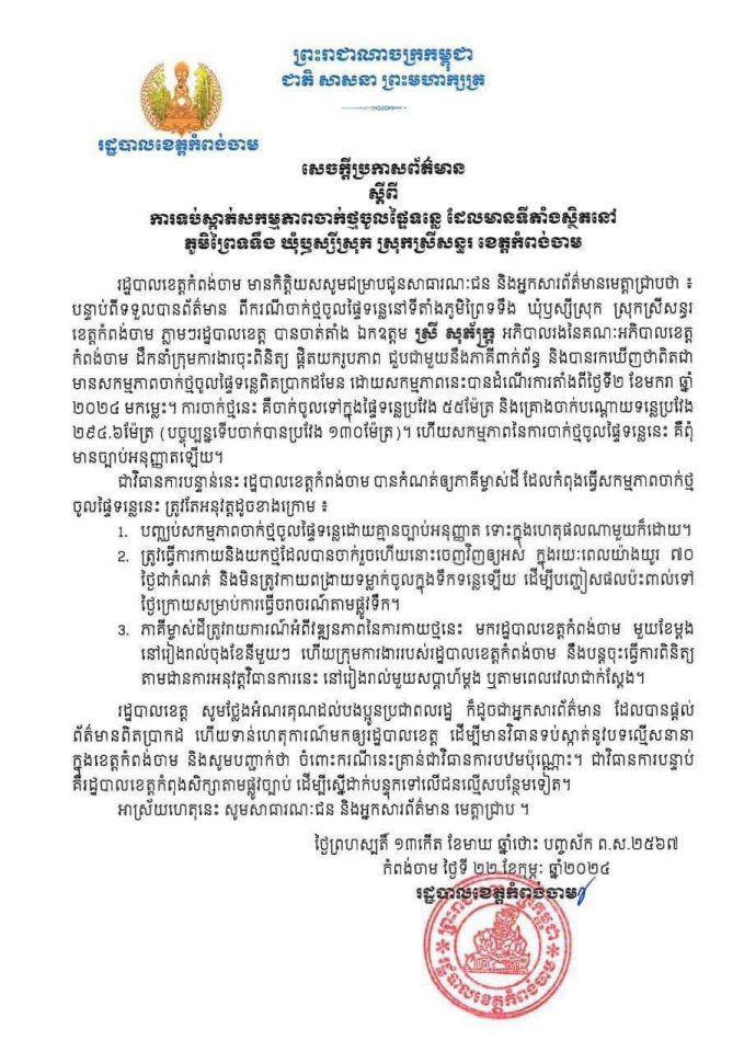 ក្រោយពីបានឃេីញនូវសេចក្ដីប្រកាសព័ត៌មាន របស់រដ្ឋបាលខេត្ត កំពង់ចាម រួចមក ប្រជាពលរដ្ឋបានប្រតិកម្មចោទសួរទៅកាន់ លោកអភិបាលនៃគណ:អភិបាល ខេត្ត កំពង់ចាម ថា តើលោកមាននៅ ចាំដែរទេ នូវប្រសាសន៏សម្ដេច មហាបវរធិបតី កាលពី ថ្ងៃទី 30 ខែ មករា ឆ្នាំ 2024 ពាក់ពន្ធ័ នឹងតំបន់ បឹងទន្លេសាប នោះ កុំនិយាយថា ទេ ខ្ញុំការពារតែ បឹងទន្លេសាប ទេ ទន្លេមេគង្គ ខ្ញុំមិនដឹងទេ ! ហើយតើ #បគ្គលដែលហ៊ានរំលោភបំពាន នឹងយកថ្មមកចាក់ក្នុងដងទន្លេមេគង្គ ទំនងបម្រុងធ្វេីជាទំនប់ រួចចាក់ដីចូលតាមក្រោយនោះ #មានអំណាច ប៉ុណ្ណា? តែបើយោងតាមសេចក្ដីប្រកាសព័ត៌មាន លោក អភិបាលខេត្ត #គរាន់តែបញ្ជាឲ្យ #រះរើហើយ ចប់រឿង #មនមានវិធានការណ៍ #ផលូវច្បាប់ណាមួយ ដាក់ពិន័យទៅលើក្រុមបុគ្គល ទាំងនោះ ឡើយ ។