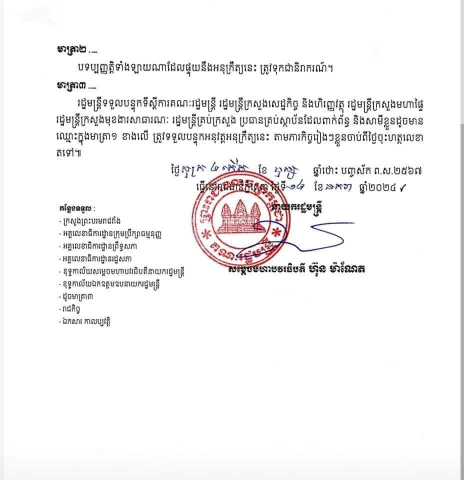 ថ្ងៃនេះខ្ញុំមានការចាំបាច់ត្រូវអនុវត្តអភិក្រមទី៥ គឺ “ការវះកាត់” តាមរយៈការចុះហត្ថលេខា ដើម្បីបញ្ចប់មុខតំណែងរបស់អភិបាលក្រុងកែប ដែលបានប្រើប្រាស់អំណាចនៃតួនាទីរបស់ខ្លួនប្រព្រឹត្តអំពើដែលនាំឲ្យប៉ះពាល់ដល់ផលប្រយោជន៍រដ្ឋ និងផលប្រយោជន៍របស់ប្រជាពលរដ្ឋជាច្រើន។ ការសម្រេចចិត្តនេះគឺផ្អែកទៅលើមូលដ្ឋានច្បាស់លាស់ នៃការស៊ើបអង្កេតរបស់អង្គភាពប្រឆាំងអំពើពុករលួយ។