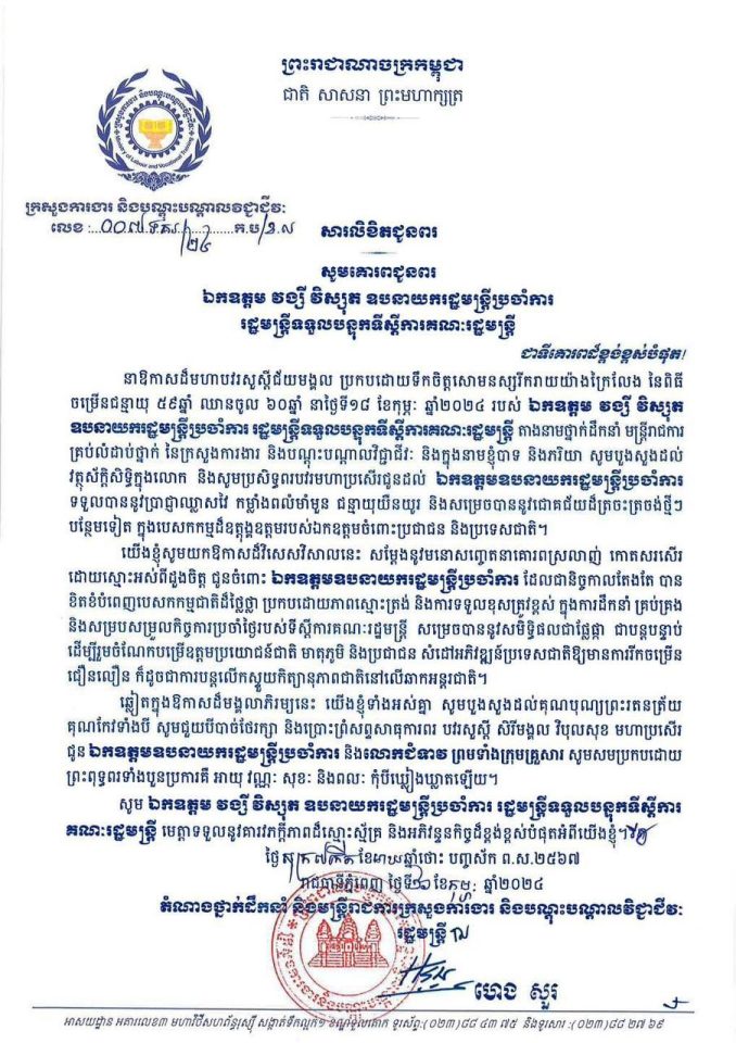 សារលិខិតជូនពរ ឯកឧត្តម វង្សី វិស្សុត ឧបនាយករដ្ឋមន្ត្រីប្រចាំការ រដ្ឋមន្ត្រីទទួលបន្ទុកទីស្តីការគណៈរដ្ឋមន្ត្រី