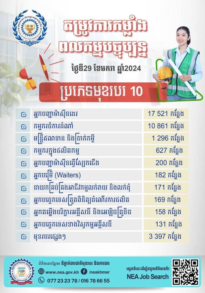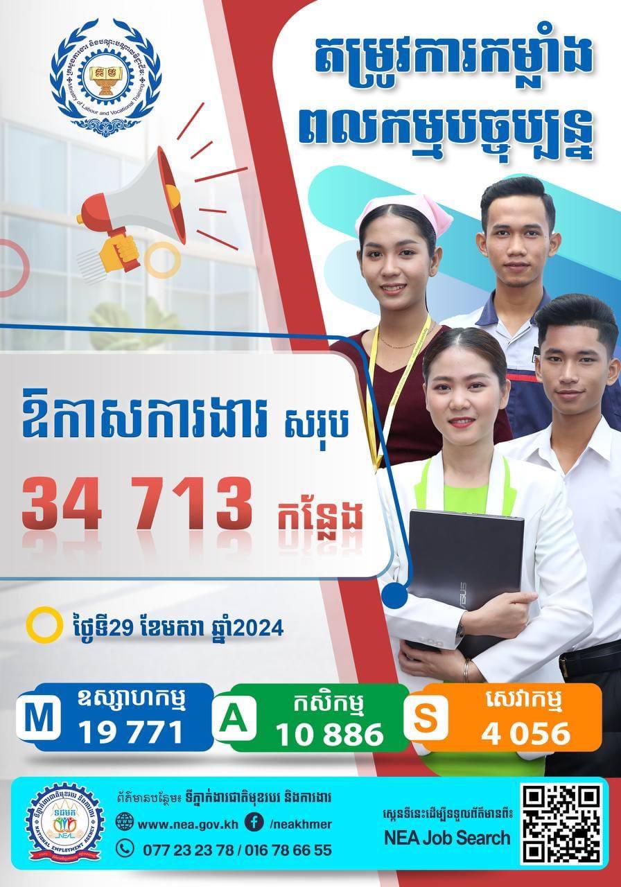 🔔សម្រាប់បងប្អូនប្រជាពលរដ្ឋដែលចង់ស្វែងរកការងារ សូមទាក់ទងមកទីភ្នាក់ងារជាតិមុខរបរ និងការងារ (NEA) នៃក្រសួងការងារ និងបណ្តុះបណ្តាលវិជ្ជាជីវៈ តាមលេខទូរស័ព្ទ 077 23 23 78 ឬ 016 78 66 55 (Telegram)។
