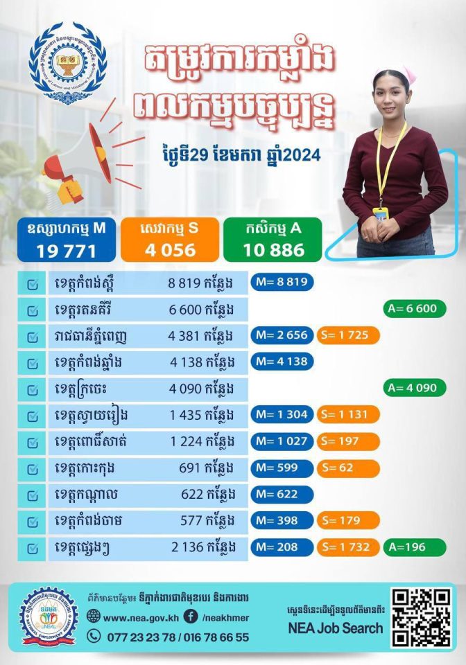 ឱកាសការងារក្នុងស្រុក សម្រាប់ថ្ងៃចន្ទ ទី ២៩ ខែមករា ឆ្នាំ២០២៤នេះ មានចំនួន ៣៤ ៧១៣ កន្លែង!