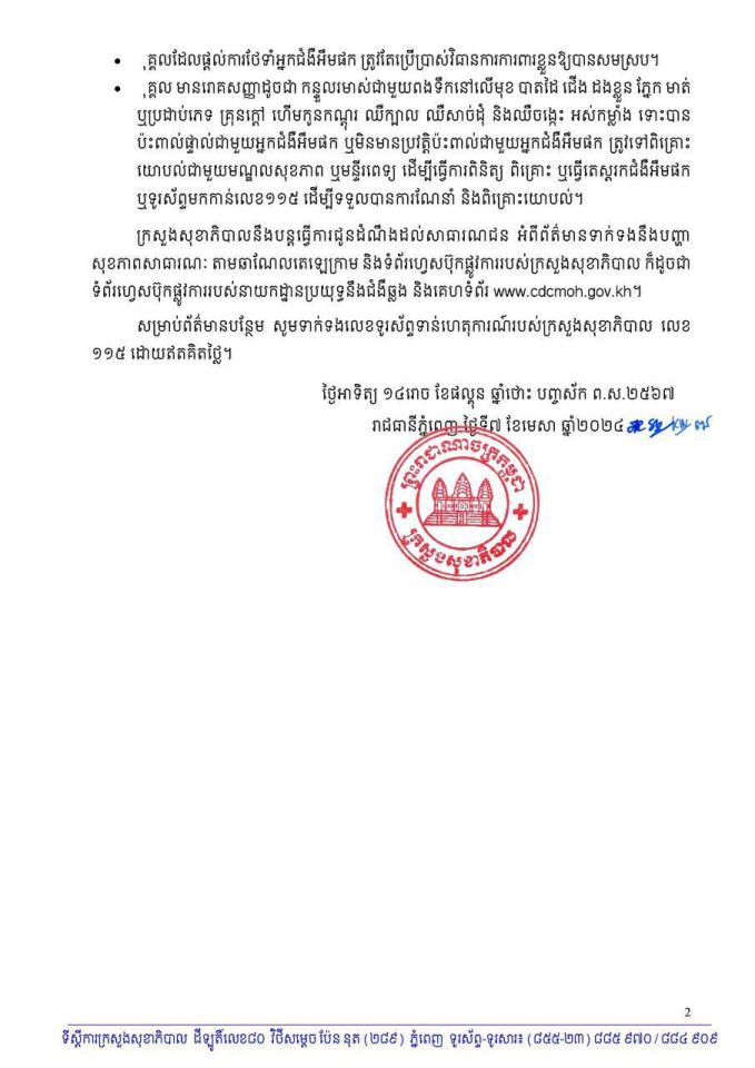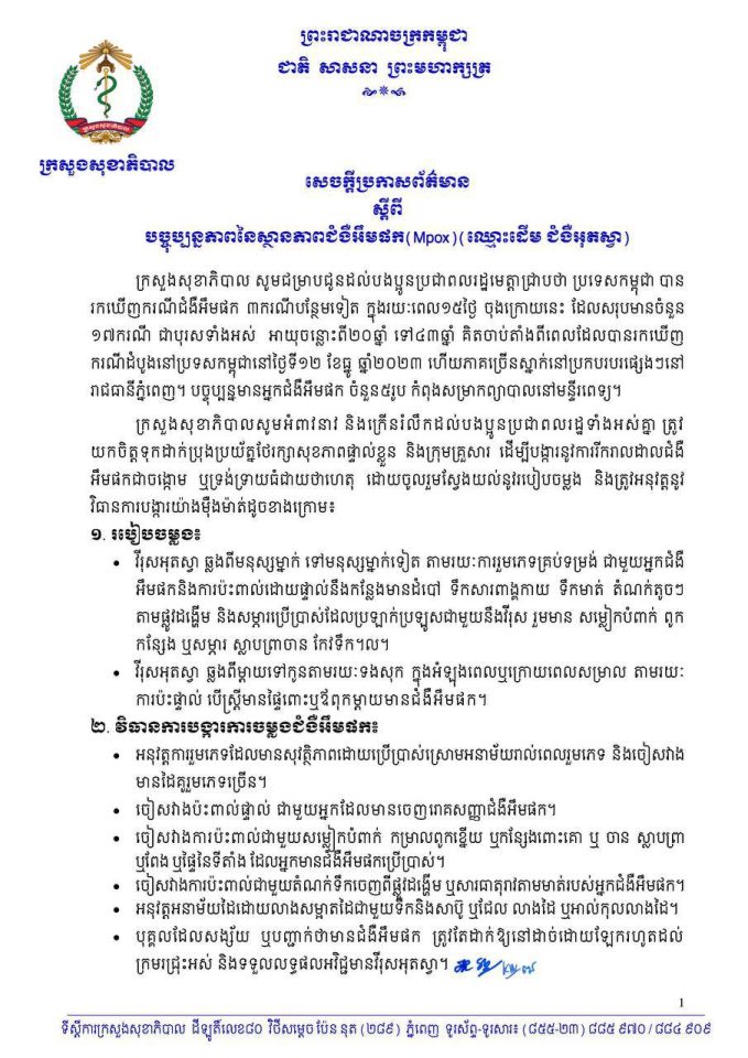 (ភ្នំពេញ)៖ កម្ពុជា បានរកឃើញករណីជំងឺ អឹមផក ដែលឈ្មោះដើមហៅជំងឺអុតស្វាចំនួន ៣ករណីបន្ថែមទៀត ក្នុងរយៈពេល១៥ថ្ងៃចុងក្រោយនេះ ដែលសរុបមានចំនួន ១៧ករណីជាបុរសទាំងអស់ ហេីយបច្ចុប្បន្នមានមនុស្ស ៥នាក់បាននឹងកំពុងសម្រាកព្យាបាល ក្នុងមន្ទីរពេទ្យ ។ នេះបើតាមសេចក្តីប្រកាសព័ត៌មាន របស់ក្រសួងសុខាភិបាល ដែលបណ្តាញព័ត៌មាន ប្រជារាស្ត្រ ទទួលបាននាព្រឹកថ្ងៃទី៧ ខែមេសា ឆ្នាំ២០២៤ នេះ ។
