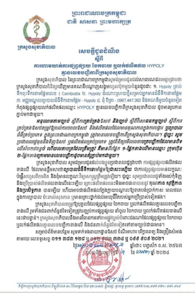 ក្រសួងសុខាភិបាលចេញសេចក្តីជូនដំណឹង ស្តីពីការហាមឃាត់ការផ្សព្វផ្សាយ ចែកចាយ ឬលក់ផលិតផល HYPOLY