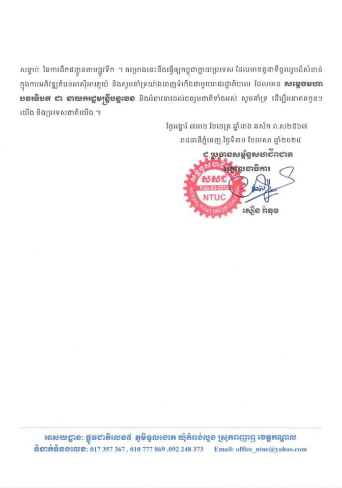 សម្ព័ន្ធសហជីពជាតិ ដែលជាសហជីពឯករាជ្យ និងសមាជិក-សមាជិកា បានប្រកាសគាំទ្រយ៉ាងពេញទំហឹងចំពោះគំនិតផ្តួចផ្តើមរបស់ សម្តេចអគ្គមហាសេនាបតី តេជោ ហ៊ុន សែន ប្រធានព្រឹទ្ធសភា និងជាប្រធានក្រុម ឧត្តមប្រឹក្សាផ្ទាល់ព្រះមហាក្សត្រ ព្រមទាំង សម្តេចមហាបវរធិបតី ហ៊ុន ម៉ាណែត នាយករដ្ឋមន្ត្រីនៃព្រះរាជាណាចក្រកម្ពុជា ដែលបានជម្រុញការអភិវឌ្ឍគម្រោងព្រែកជីកហ្វូណន-តេជោ ដ៏មានសក្កានុពល និងអត្ថប្រយោជន៍យ៉ាងច្រើនសន្ធឹកសន្ធាប់ក្នុងវិស័យដឹកជញ្ជូនផ្លូវទឹក សម្រាប់ប្រជាជាតិកម្ពុជាទាំងមូល ។