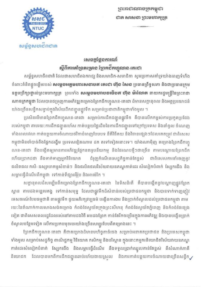 សម្ព័ន្ធសហជីពជាតិ ចេញសេចក្តីថ្លែងការណ៍ ស្តីពីការគាំទ្រគម្រោង ព្រែកជីកហ្វូណន-តេជោ