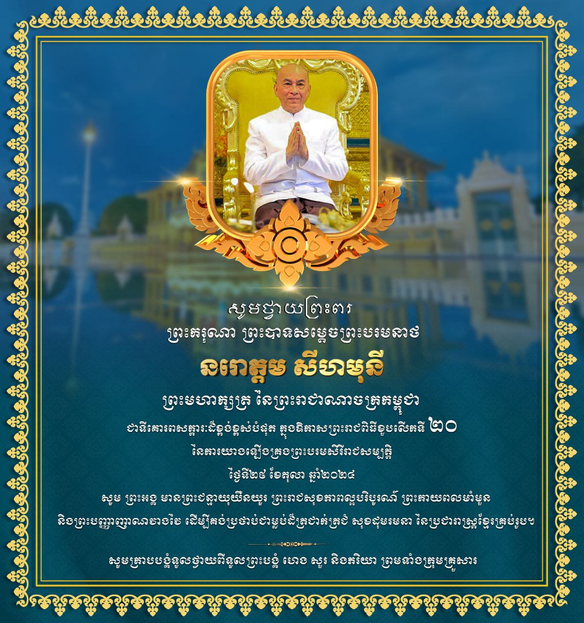 ឯកឧត្តម ហេង សួរ និងភរិយា ព្រមទាំងមន្ត្រីរាជការក្រោមឳវ៉ាត ទាំងអស់ ថ្វាយលិខិតជូនព្រះពរព្រះករុណា ព្រះបាទសម្តេចព្រះបរមនាថ នរោត្តម សីហមុនី ព្រះមហាក្សត្រនៃព្រះរាជាណាចក្រកម្ពុជា ជាទីគោរពសក្ការៈដ៏ខ្ពង់ខ្ពស់បំផុត ក្នុងឱកាសព្រះរាជពិធីខួបទី ២០ នៃការយាងឡើងគ្រងព្រះបរមសិរីរាជសម្បត្តិ ថ្ងៃទី២៩ ខែតុលា ឆ្នាំ២០២៤។